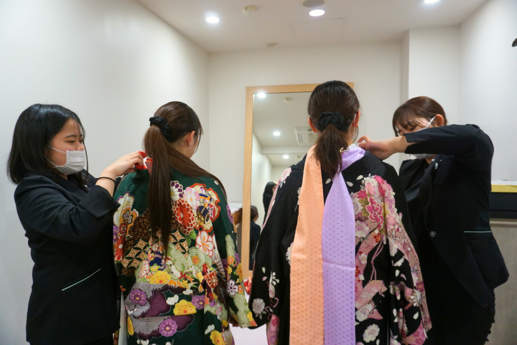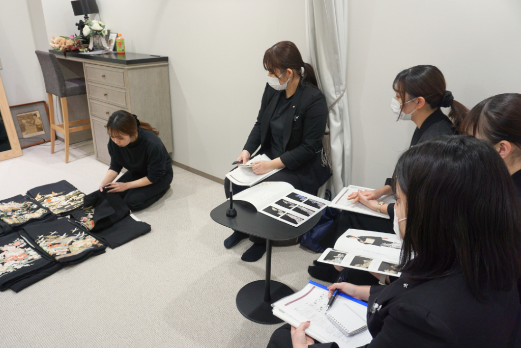 その後は、先輩スタッフによるお手本を見学。着せ方の手順だけでなく、所作や声かけまで実践的に学びます。また、「色留袖」や「訪問着」の違いの解説も受け、立場に合わせた着物選びのポイントを学びました。